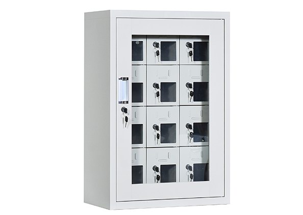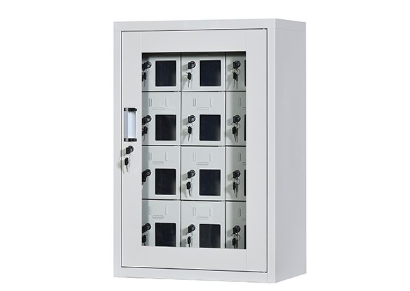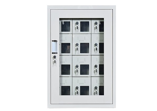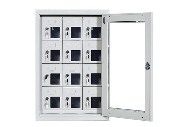 手机保密柜正面为对开金属边框玻璃大门,便于观察柜内情况,坚固透亮,美观大方。